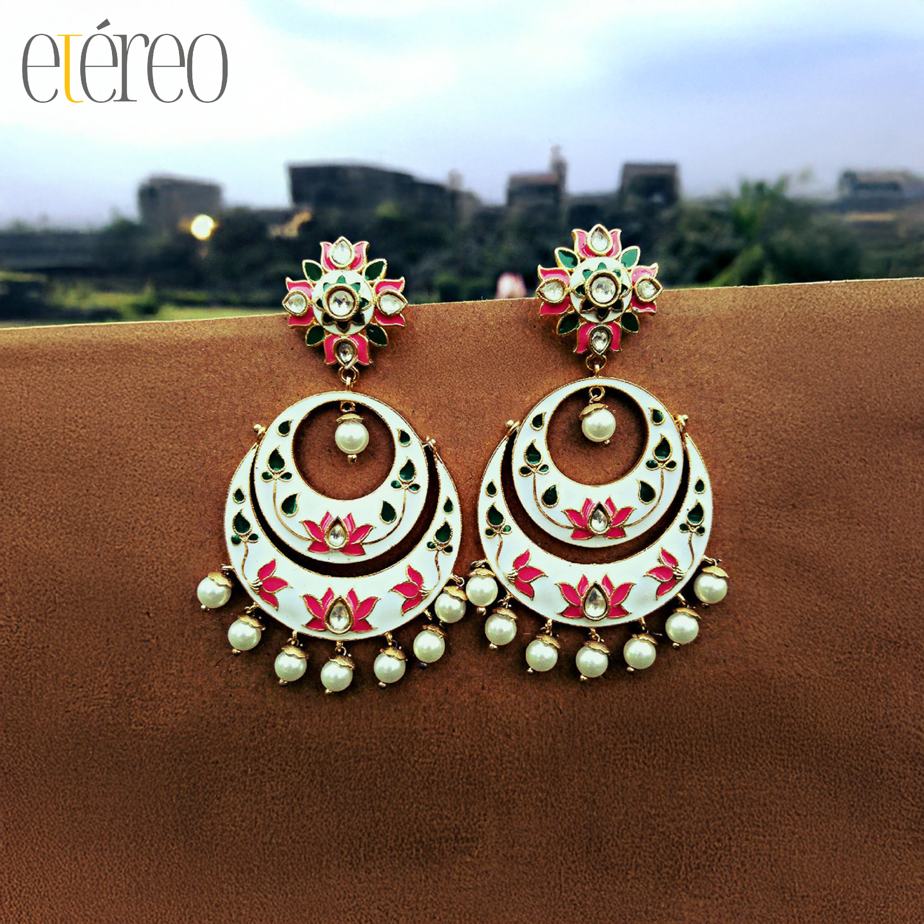 ER13DE162-Lotus and white Meenakari Chaandbaali