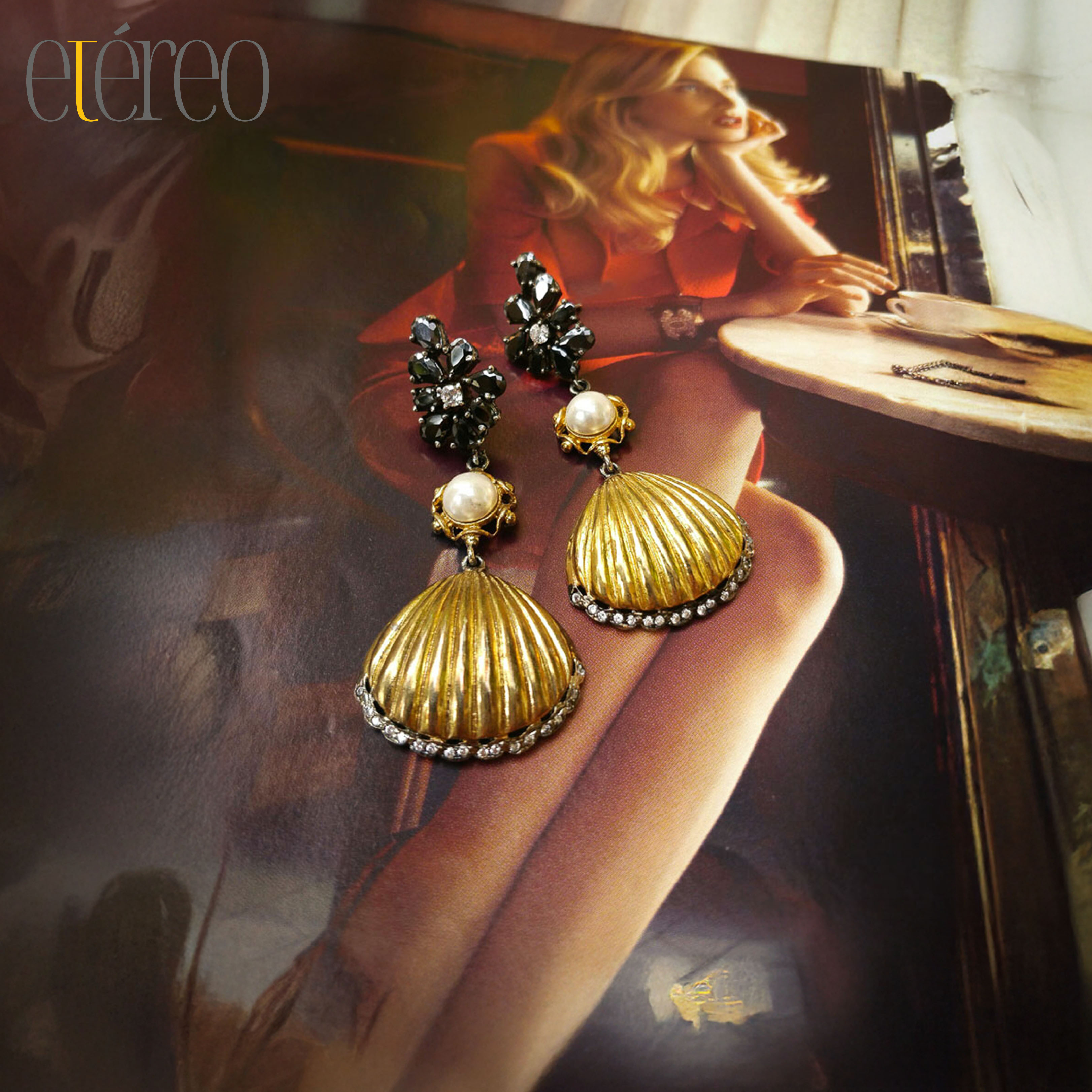 Shell-shaped earrings with zircon outlines, featuring black gemstones at the top. Elegant, gold-toned, detailed, and sophisticated design.